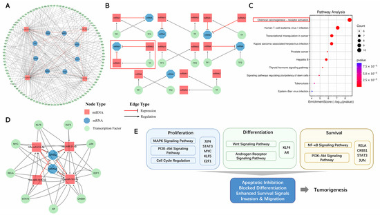 The TF–miRNA–mRNA regulatory network of TNBC. (A) A global network of TF–miRNA–mRNA interactions. The edge types are represented as follows: a red line with an inhibition arrow indicates that the miRNA represses the target mRNA, while a gray line with an arrow represents TF regulation on genes, without a specific indication of activation or repression. The nodes are classified into three types: red for miRNAs, blue for mRNAs, and green for TFs; (B) eight different types of four-node regulatory motifs. Red circles the motif with coherent FFL; (C) KEGG analysis of TFs belonging to coherent FFL. Red circles the most enriched KEGG pathway; (D) the coherent FFL motif subnetwork of the most enriched KEGG pathway; (E) the functional annotation of TFs in the most enriched KEGG pathway.