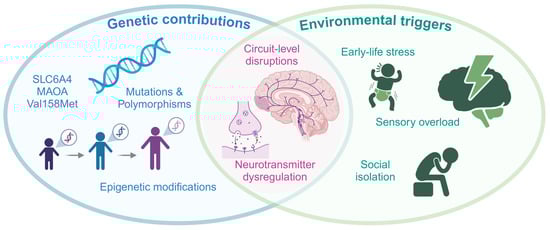 Several genetic syndromes associated with intellectual and developmental disabilities include SIB as a core symptom, including Lesch-Nyhan, Fragile X, Prader-Willi, Smith-Magenis, Cri-du-Chat, Angelman, Lowe, and Cornelia de Lange syndromes [8,9,10,11,12,34]. In these syndromes, mutations in genes such as HPRT1 (Lesch–Nyhan syndrome), FMR1 (Fragile X), UBE3A (Angelman syndrome), OCRL1 (Lowe syndrome), and the cohesin complex (Cornelia de Lange syndrome), as well as chromosomal deletions in 15q11-q13 (Prader–Willi and Angelman syndrome), 5p (Cri-du-Chat syndrome), and 17p (Smith-Magenis syndrome) disrupt critical pathways regulating neurotransmitter metabolism and synaptic function [17,35,36]. In ASD, mutations on SHANK3 impair synaptic scaffolding and glutamatergic signalling, leading to aberrant cortico-striatal circuit activity, a hallmark of SIB [37]. Candidate gene studies have further identified polymorphisms in genes associated with neurotransmitter regulation as potential contributors to SIB. Variants in the serotonin transporter gene (SLC6A4), monoamine oxidase A gene (MAOA), and dopamine receptor genes (DRD4 and COMT) have been linked to impulsivity, aggression, and repetitive behaviours [38,39,40]. For example, individuals with low-activity MAOA alleles exhibit heightened susceptibility to aggressive tendencies and SIB under stress [41,42]. Similarly, the brain-derived neurotrophic factor (BDNF) Val66Met polymorphism influences neurotrophic support and synaptic plasticity, modulating the risk for SIB in the presence of childhood trauma or stress [41,42,43].