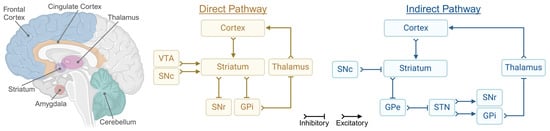 In contrast, the indirect pathway suppresses excessive or inappropriate motor and emotional outputs [17,19,95]. In this pathway, cortical input activates striatal MSNs expressing dopamine D2 receptors, which project inhibitory signals to the globus pallidus externa (GPe) [17,19,95]. The GPe normally exerts an inhibitory influence on the subthalamic nucleus (STN). Inhibition of the GPe by the indirect pathway releases the STN from this suppression, allowing it to send excitatory glutamatergic input to the GPi and SNr [17,19,95]. This increased activity in the GPi and SNr enhances their inhibitory output to the thalamus, ultimately reducing motor activity [17,19,95] (Figure 2). Dopaminergic input from the SNc attenuates the activity of D2 receptor-expressing neurons, weakening the indirect pathway and favouring motor activation when required.