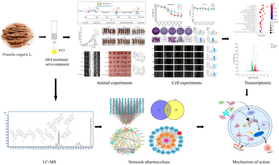 In this study, the effects of triterpene of Prunella vulgaris (PVT) on TNBC were verified through in vivo and in vitro studies, and the mechanism by which PVT affects TNBC was explored through network pharmacology and transcriptomics analysis and then verified by molecular biology techniques.