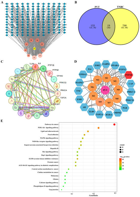 Network pharmacological analysis of PVT against TNBC. (A) Target network diagram of 9 triterpenes of PVT; (B) Venn diagram of common targets of triterpenes and TNBC; (C) PPI network diagram of intersecting targets of triterpenes and TNBC; (D) triterpenes and intersection targets network diagram; (E) intersection target KEGG pathway enrichment diagram.
