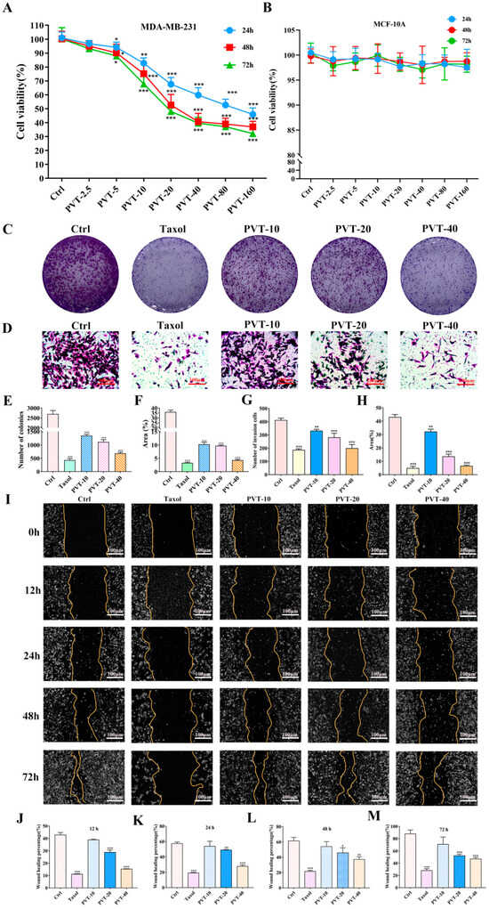 Effects of total triterpenoids (PVT) on proliferation, migration and invasion of MDA-MB-231 cells. (A,B) Cell viabilities of MDA-MB-231 and MCF-10A were assessed after treated with PVT (0–160 μg·mL−1) for 24 h, 48 h and 72 h (mean ± SD, n = 5; * p < 0.05, ** p < 0.01, *** p < 0.001); (C) effect of PVT on colony formation of MDA-MB-231 cells; (D) cell clonal formation statistics; (E) percentage of clonal formation area; (F) effect of PVT on invasion of MDA-MB-231 cells; (G) statistics of number of invasive cells; (H) percentage of invasion area; (I) effect of PVT on migration of MDA-MB-231 cells; (J–M) statistical chart of healing area 12 h, 24 h, 48 h and 72 h after administration. Concentration of Taxol in cell experiments was 50 nM. (E–H,J–M, mean ± SD, n = 3; * p < 0.05, ** p < 0.01, *** p < 0.001).