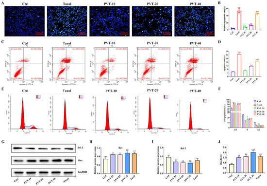Effect of PVT on apoptosis and cell cycle of MDA-MB-231 cells (mean ± SD, n = 3; * p < 0.05, ** p < 0.01, *** p < 0.001). (A) Hochest33342 staining; (B) apoptosis statistical map; (C) apoptosis flow chart; (D) apoptosis flow chart; (E) cell cycle flow chart; (F) cell cycle flow chart; (G) apoptosis-related protein Bax and Bcl-2 protein strip chart; (H) protein Bax/GAPDH statistical map; (I) protein Bcl-2/GAPDH statistical map; (J) statistical diagram of protein Bax/Bcl-2. Concentration of Taxol in cell experiments was 50 nM.