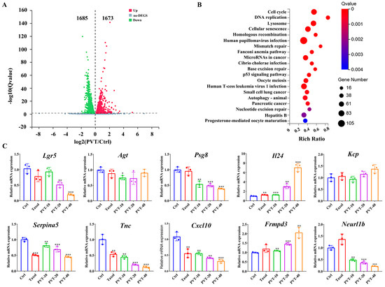 To systematically investigate the biological processes underlying the inhibition of breast cancer cell proliferation by PVT, MDA-MB-231 cells treated with PVT or not were sequenced by transcriptome sequencing. The results of the differential expression analysis revealed that a total of 1673 genes were upregulated and 1685 genes were downregulated in the MDA-MB-231 cells (Figure 6A). KEGG enrichment analysis revealed that the most significant pathways with differential gene expression included the cell cycle, DNA replication and related pathways (Figure 6B). A qRT-PCR assay was used to verify the top five downregulated and upregulated genes (Table 3) in the transcriptomic results, which revealed that PVT significantly upregulated the mRNA expression levels of Il24 and Frmpd3 and downregulated the mRNA expression levels of Serpina5, Tnc, Cxcl10, Neurl1b, Lgr5 and Psg8 (Figure 6C); these results are consistent with those of the transcriptome analysis section.
