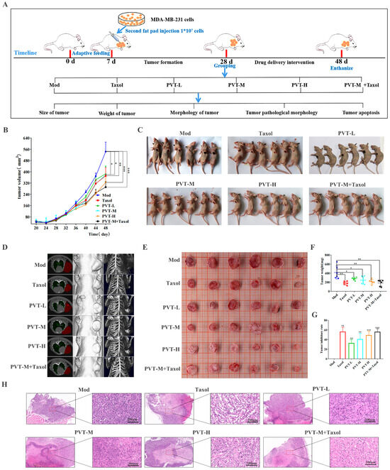 PVT inhibited tumor progression in mice with TNBC (mean ± SD, n = 6; * p < 0.05, ** p < 0.01, *** p < 0.001). (A) A schematic of the experiment; (B) tumor growth curves among different groups; (C) tumor-bearing nude mice; (D) two-dimensional and three-dimensional images of nude mice were made through micro-CT scanning; (E) tumor sizes among different groups; (F) tumor weight among different groups; (G) statistical graph of drug inhibition rate of tumors; (H) representative H&E-stained sections of tumors from different groups. Dosage of Taxol in animal experiments was 20 mg·kg−1.