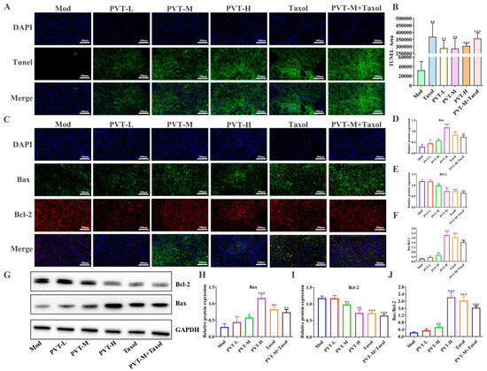 The apoptosis of tumor cells in situ was detected by TUNEL fluorescence staining. As shown in Figure 8A,B, there was little green fluorescence in the Mod group, indicating that the number of apoptotic cells was very low. Compared with those in the Mod group, there was a large amount of green fluorescence and there were no nuclei in some parts of the tumor tissue in the Taxol group. The numbers of TUNEL-positive cells in the PVTL, PVTM, PVTH and PVTM + Taxol groups were significantly greater, and the apoptosis indices were significantly greater, indicating that both PVT and Taxol could promote the apoptosis of tumor cells. In addition, detection of the Bax and Bcl-2 proteins in tumor tissues by WB (Figure 8G–J) and immunofluorescence (Figure 8C–F) revealed that PVT effectively upregulated the proapoptotic protein Bax and downregulated the antiapoptotic protein Bcl-2.