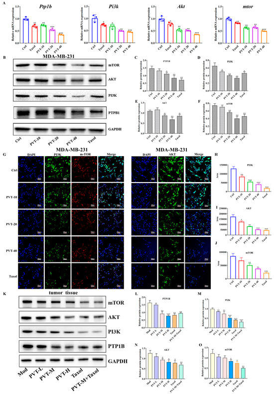 Effects of PVT on PTP1B/PI3K/AKT/mTOR pathway in MD-MB-231 cells and tumor tissues (mean ± SD, n = 3; * p < 0.05, ** p < 0.01, *** p < 0.001). (A) mRNA levels of Ptp1b, Pi3k, Akt and mtor in different groups of MDA-MB-231 cells; (B–F) expression levels of PTP1B, PI3K, AKT and mTOR in MDA-MB-231 cell lines were analyzed by Western blot after 48 h of PVT treatments; (G–J) expression levels of PI3K, AKT and mTOR in MDA-MB-231 cell lines were analyzed by immunofluorescence after 48 h of PVT treatments; (K–O) expression levels of PTP1B, PI3K, AKT and mTOR in tumor tissues of nude mice were analyzed by Western blot after 48 h of PVT treatments.