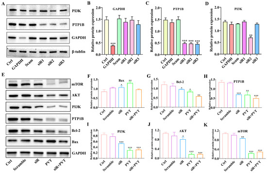 Regulation of PTP1B on PI3K/AKT/mTOR (mean ± SD, n = 3; * p < 0.05, ** p < 0.01, *** p < 0.001). (A–D) PTP1B was inhibited by siRNA; (B–K) expression of PI3K, AKT, mTOR, Bax and Bcl-2 proteins after silencing PTP1B.