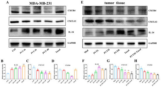 Effects of PVT on IL-24/CXCL12/CXCR4 pathway in MD-MB-231 cells and tumor tissues (mean ± SD, n = 3; * p < 0.05, ** p < 0.01, *** p < 0.001). (A–D) Expression of IL-24, CXCL12 and CXCR4 proteins in MDA-MB-231 cells; (E–H) expression of IL-24, CXCL12 and CXCR4 proteins in TNBC tumor tissues.