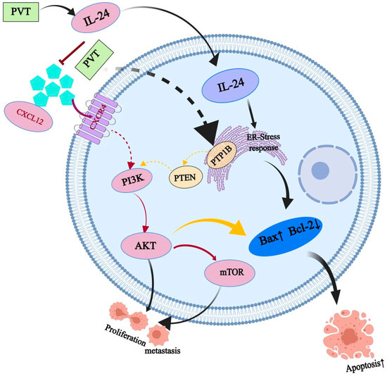 The PI3K/AKT signaling pathway is one of the most frequently activated pathways in human tumors and can promote tumor proliferation and migration through the regulation of tumor metabolism. Through molecular biological verification, it was found that PVT can upregulate the IL-24 and Bax proteins and downregulate PTP1B, PI3K, AKT, mTOR, CXCL12, CXCR4, Bcl-2 and other proteins. It can inhibit the proliferation of tumor cells, promote their apoptosis and inhibit the metastasis of tumor cells to achieve antitumor effects.
