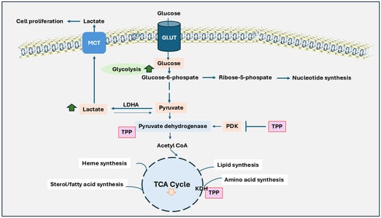 A metabolic shift known as the Warburg effect (Figure 1) is often observed in the initial stages of cancer cell proliferation. This phenomenon, which has become a focus of alternative chemotherapeutic strategies, describes how cancer cells rely on glycolysis and fermentation of lactic acid for energy production, even in the oxygen presence [,]. This preference for glycolysis provides tumor cells with the metabolic intermediates necessary for rapid cell growth and survival. The role of TPP in the Warburg effect is shown in Figure 1. In addition, the individual roles of B vitamins on the Warburg effect are shown in Table 2. The overexpression of pyruvate dehydrogenase kinase (PDK) in cancer cells inactivates pyruvate dehydrogenase (PDH), effectively disconnecting glycolysis from the Krebs cycle and enhancing glycolytic activity []. The inhibition of PDK by TPP has shown promise in triggering apoptosis and reducing tumor cell proliferation by restoring PDH activity [,,]. Through its role in maintaining PDH complex activity, thiamine has been shown to decrease tumor cell proliferation and glycolytic activity by countering PDK-induced PDH inactivation [].