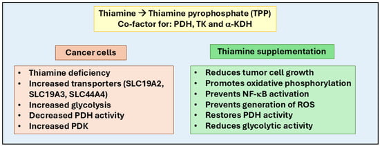 Role of thiamine in cancer progression and therapy. Thiamine (Vitamin B1) plays a crucial role in cellular metabolism by converting into thiamine pyrophosphate (TPP), a co-factor for enzymes like pyruvate dehydrogenase (PDH), transketolase (TK), and alpha-keto dehydrogenase (α-KDH). These enzymes regulate glycolysis, the pentose phosphate pathway, and the Krebs cycle, essential for ATP and NADPH production, DNA/RNA synthesis, and oxidative stress reduction. In cancer cells, thiamine influences the Warburg effect, where cancer cells rely on glycolysis even in oxygen-rich environments, often due to pyruvate dehydrogenase kinase (PDK) overexpression, which inhibits oxidative phosphorylation. Thiamine supplementation counters this by restoring PDH activity, reducing glycolytic dependence, and promoting oxidative metabolism. Cancer cells modulate thiamine uptake via transporters like SLC19A2, SLC19A3, and SLC44A4. Therapeutically, supplementation with thiamine and its derivatives (such as benfotiamine and oxythiamine) could inhibit tumor growth, reduce oxidative stress, prevent NF-κB-mediated inflammatory signaling, reduce glycolytic activity, and promote oxidative phosphorylation.