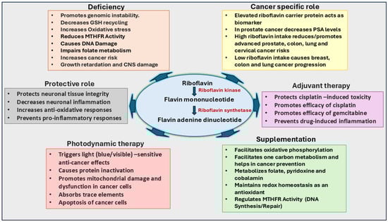 In esophageal cancer, riboflavin deficiency has been linked to changes in the esophageal epithelium, increasing the risk of cancer development [,]. Supplementation with riboflavin and niacin has shown effectiveness in reducing esophageal cancer incidence in regions with high rates of the disease []. Higher riboflavin intake, especially among female non-smokers, has also been associated with a reduced risk of lung cancer []. Riboflavin deficiency is also linked to cervical dysplasia, a precursor to cervical cancer []. In addition, riboflavin, combined with other B vitamins, such as thiamine, folate, or cobalamin, could offer protection against the progression of cancer [,,]. Indeed, a recent study suggests that intake of riboflavin at a dose of 1.2 to 2.4 mg/day could contribute to a reduced risk of cervical cancer in Korean women []. Thus, recent studies suggest that riboflavin could be adjuvant therapy to increase the efficacy of anti-cancer drugs. However, its individual effects on cancer prevention and treatment need additional studies.