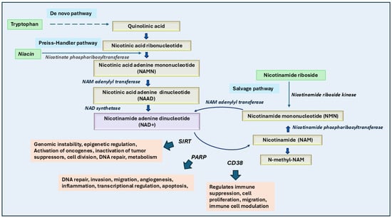 Further, niacin, through its precursor nicotinamide (NAM), contributes to the production of NAD+, which in turn acts as a substrate for key enzymes like sirtuin 1 (SIRT1) and poly ADP-ribose polymerase 1 (PARP1) []. These enzymes play a role in DNA repair, apoptosis, and carcinogenesis [,,]. Thus, the therapies targeting NAD+ metabolism, such as PARP and NAMPT inhibitors, could enhance cancer cell death by blocking NAD+ dependency. Thus, the modulation of NAD+/NADH balance demonstrates a promising therapeutic strategy, but its effects depend on the specific cancer type and treatment approach. As with all essential nutrients, niacin deficiencies can significantly affect human health. The most severe effects of niacin deficiency are manifest in Pellagra, a disease characterized by the “three D’s”: dermatitis (often presenting as a casal necklace), diarrhea, and dementia []. Pellagra can also occur in Hartnup disease, where the failure to absorb amino acids like tryptophan through the intestine and kidneys leads to a secondary niacin deficiency [].