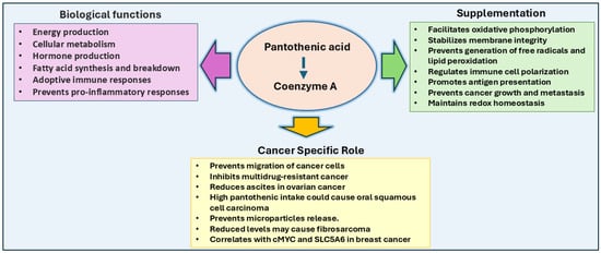 Pantothenic acid in cancer: Pantothenic acid is a precursor to Coenzyme A (CoA) and is vital for numerous metabolic processes, including the citric acid cycle, fatty acid metabolism, and hormone production. Increased pantothenic acid levels correlate with enhanced glycolytic activity and cancer cell migration, particularly in breast and gastric cancer cells, and its association with c-MYC and SLC5A6 expression promotes breast cancer growth. Pantothenic acid supplementation could enhance immune responses by increasing antigen presentation, shifting tumor metabolism from glycolysis to oxidative phosphorylation, and preventing tumor growth. High intake has been linked to oral squamous cell carcinoma risk, and pantothenate supplementation has been shown to treat multidrug-resistant cancers and reduce metastasis.