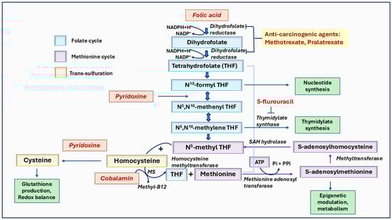 The role of vitamins B6, B9, and B12 mediated one-carbon metabolism in cancer. Folate (vitamin B9) is converted to dihydrofolate and then to tetrahydrofolate (THF), which undergoes further modifications to form derivatives like N5, N10-methylene THF, and N5-methyl THF. These derivatives are essential for methylation processes, and nucleotide synthesis requires cancer cell growth. The pathway highlights the involvement of pyridoxine (vitamin B6) in converting homocysteine to cysteine via the trans-sulfuration pathway and cobalamin (vitamin B12) in the re-methylation of homocysteine to methionine, which subsequently forms S-adenosylmethionine (SAM), a key methyl donor in several biochemical and epigenetic methylations. Anti-carcinogenic agents, such as methotrexate and pralatrexate, inhibit steps in folate metabolism, while 5-fluorouracil blocks nucleotide synthesis. This pathway underscores the interdependence of folate, pyridoxine, and cobalamin in one-carbon metabolism in essential biological functions like methylation, DNA synthesis, and cellular regulation.