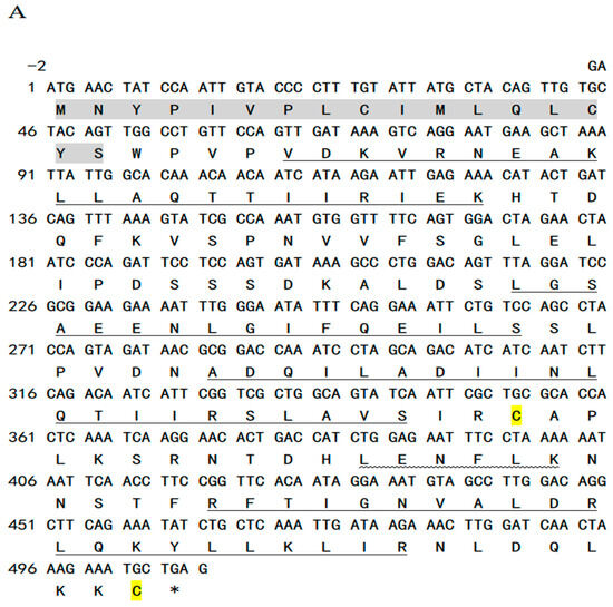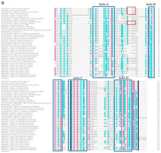 This study successfully cloned the CDS sequence of leptin and a portion of the leptin receptor’s CDS fragment (Figure S1) using RT-PCR. The cloned leptin cDNA in Siberian sturgeon was 510 bp, encompassing a 507 bp ORF, which encoded a precursor protein of 168 amino acids. Siberian sturgeon leptin contained a signal peptide (1–17 aa) and alpha-helical domains (designated helix A–D, located at amino acid positions 23–41, 73–87, 93–115, and 143–164). Furthermore, a small helical segment was identified between helix C and D (helix E, 129–136 aa). In addition, the leptin protein in Siberian sturgeon featured a pair of cysteine residues at positions 118 and 168 (Figure 1A).