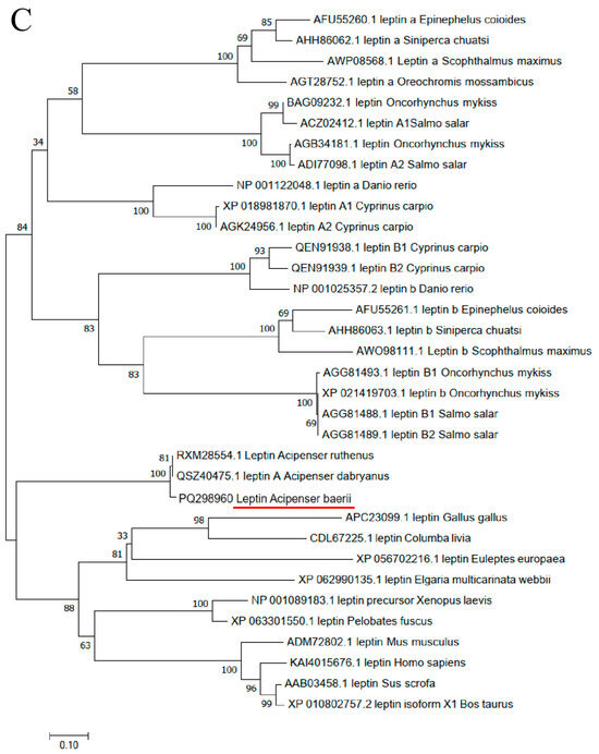 The cloned leptin sequence of the Siberian sturgeon analyzed in this study includes a signal peptide, four reverse helix domains, and one small helix segment (helix E) situated in the loop connecting helix C and helix D. This result aligns with most studies on the secondary structure of leptin in both mammals and fish [2]. Moreover, similar to other fish species such as the snakehead fish [21] and Yangtze sturgeon [22], we identified a pair of cysteine residues (located at positions 118 and 168 aa, respectively) in the leptin of the Siberian sturgeon, which are capable of forming disulfide bonds that connect helixes C and D. The spatial configuration of the four reverse helix domains, supported by these disulfide bonds and helix E, is essential for binding to leptin receptors. The GLDFIP motif within the leptin molecule is recognized as being crucial for activating the leptin receptor in mammals [21]. However, Siberian sturgeon leptin lacks the GLDFIP sequence, similar to other teleosts [23]. This difference may indicate an evolutionary adaptation leading to distinct leptin–receptor interactions in aquatic vertebrates. These results suggest that the molecular mechanisms governing leptin receptor binding and activation could diverge significantly between fish and mammals. Further studies are needed to explore the interaction between leptin and its receptor.