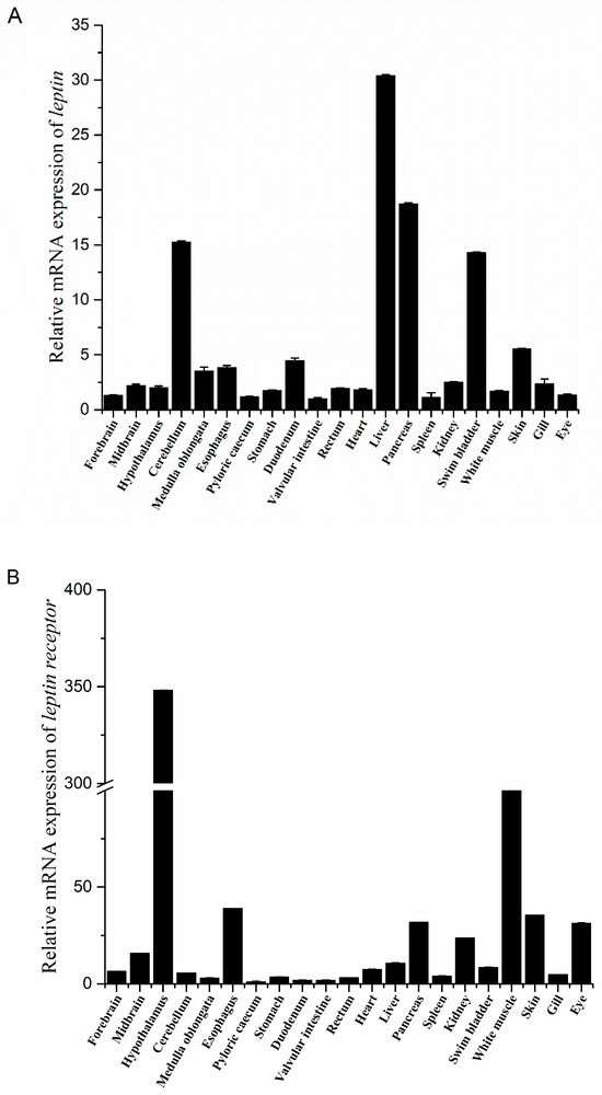 Six juvenile Siberian sturgeons (162.05 ± 6.32 g, fasted for 24 h) were sacrificed and dissected after anaesthetization with MS-222 (100 mg/L) for nearly five minutes until the fish lost their balance reflex. Five parts of the brain (forebrain, hypothalamus, midbrain, cerebellum, and medulla oblongata) and 16 other tissues (stomach, esophagus, pyloric caecum, rectum, duodenum, valvular intestine, heart, kidneys, liver, spleen, pancreas, swim bladder, white muscle, gills, skin, and eyes) were dissected for the further analysis of leptin and leptin receptor mRNA expressions in different tissues.