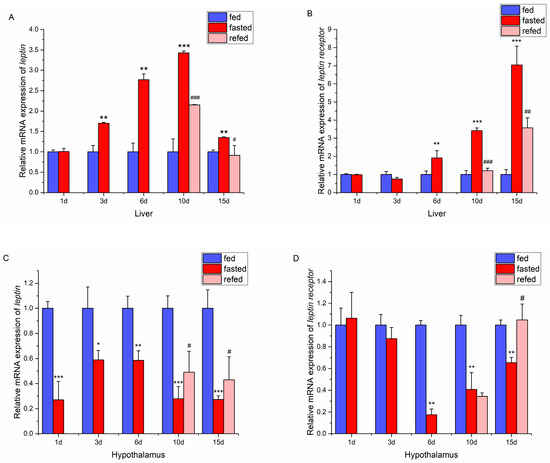 Relative mRNA expressions of leptin and leptin receptor under different nutritional statuses in the liver (A,B) and hypothalamus (C,D). The gene expression was normalized with β-actin. Student’s t-test was used to analyze the two groups’ differences at the same time point. * means p < 0.05 between feeding group and fasted group, ** means p < 0.01 between feeding group and fasted group, *** means p < 0.001 between feeding group and fasted group; # means p < 0.05 between fasted group and refeeding group, ## means p < 0.01 between fasted group and refeeding group, ### means p < 0.001 between fasted group and refeeding group.