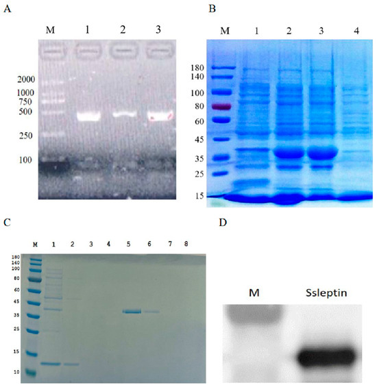 (A) The PCR amplification of leptin sequence using agarose gel electrophoresis analysis. M: maker, lane 1–3: the PCR product of leptin mature domain. (B) The soluble examination of Ssleptin protein using SDS-PAGE electrophoresis analysis: 1: vector protein samples induced for 6 h; 2: Ssleptin samples induced for 6 h; 3: the sediment of SsLeptin induced for 6 h and then lysed; 4: the supernatant of Ssleptin induced for 6 h and then lysed. (C) Different doses of imidazole eluted target protein using SDS-PAGE electrophoresis analysis. 1: Protein efflux: 2–8: different imidazole concentrations (10, 20, 50, 100, 150, 200, 300 mM). (D) Western blot analysis about Ssleptin.