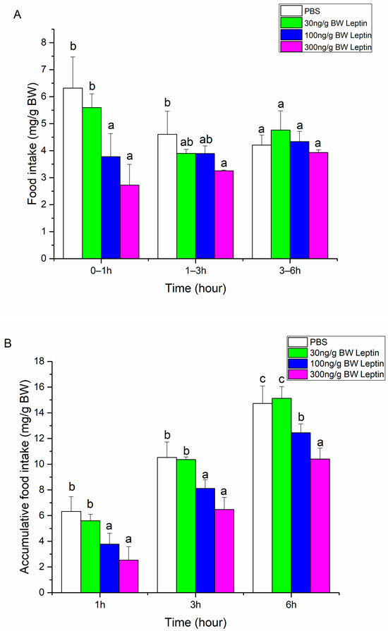 Effect of peripheral Ssleptin on food intake during period time (A) or accumulative time (B) of Siberian sturgeon. Different letters mean significant differences in food intake among groups (p < 0.05).
