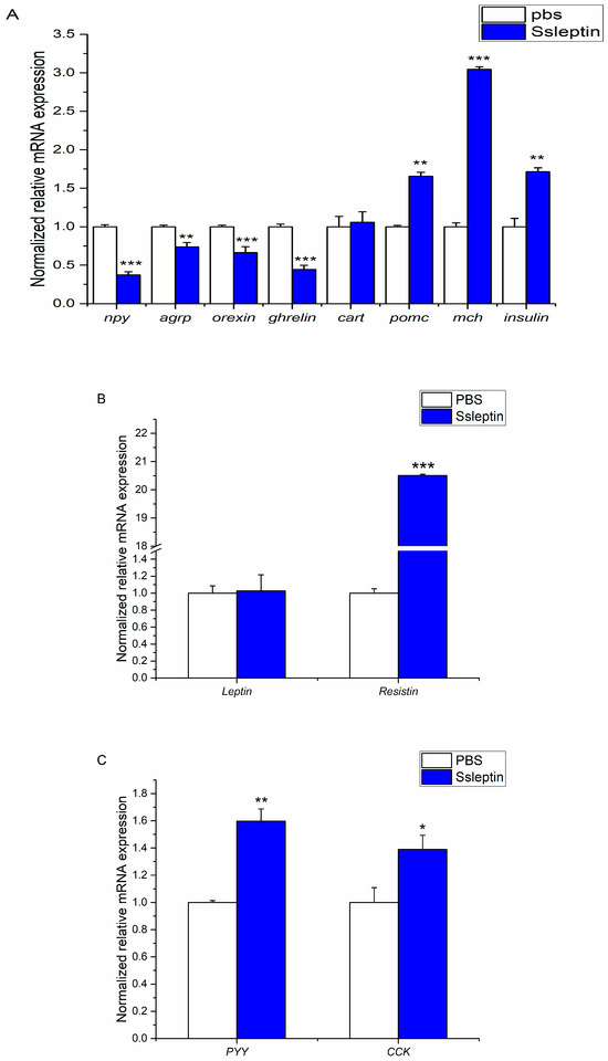 To evaluate the role of Ssleptin in appetite regulation, this present study examined the expression of appetite-related genes, including agrp, npy, ghrelin, orexin, cart, pomc, mch, insulin, resistin, pyy, and cck in the hypothalamus, liver, and valvular intestine after Ssleptin administration. At 1 h post-injection of Ssleptin (100 ng/g BW), the mRNA levels of npy, agrp, orexin, and ghrelin were significantly inhibited, while pomc, mch, and insulin were upregulated in the hypothalamus. In the liver, resistin expression was elevated after Ssleptin administration (p < 0.001). The mRNA expressions of pyy (p < 0.01) and cck (p < 0.05) in the valvular intestine were increased following SsLeptin injection (Figure 6).
