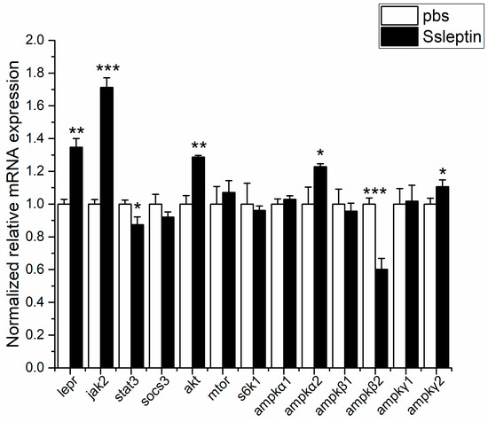 It was found that the mRNA levels of related factors in the JAK–STAT pathway were modulated after Ssleptin treatment, including the increase in jak2 mRNA expression (p < 0.001) and the decrease in stat3 expression (p < 0.05). The intraperitoneal injection of Ssleptin significantly increased ampkα2 gene expression in ampkα subunits (p < 0.05) and decreased ampkβ2 expression in ampkβ subunits (p < 0.001), with no significant changes in other subunit genes. In addition, akt expression was significantly increased after SsLeptin injection (p < 0.01), while mtor and s6k1 mRNA expressions remained unchanged. Additionally, the expression of lepr was significantly increased following Ssleptin treatment (p < 0.01) (Figure 7).