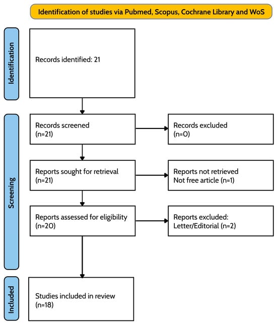 The search performed on the electronic databases, applying the filter on clinical trial and randomized controlled trial, generated only 21 articles since it is a recent and emerging topic and the first clinical trial was published in 2016. However, we excluded letters, articles without full-text, and a paper, which used the diet as an instrument for intestinal eubiosis; we selected only 18 articles, as shown in Figure 1.