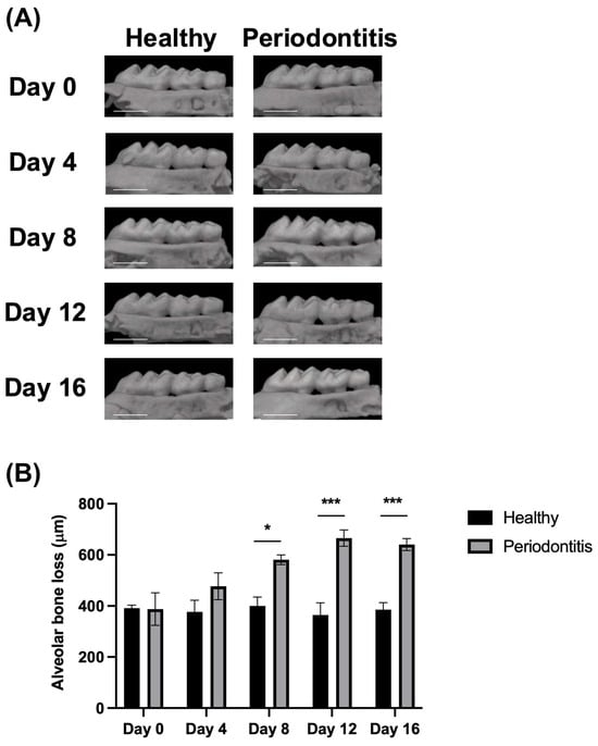 We used a mouse model of ligature-induced periodontitis to comprehensively elucidate its molecular pathogenesis. First, we assessed alveolar bone loss around the ligated teeth from days 0 to 16 using micro-computed tomography (micro-CT) imaging. Nonligated mice were used as controls (the healthy group). Micro-CT images revealed significant alveolar bone loss around the second molars in the ligated mice (the periodontitis group), particularly from day 8 to day 16, compared to the controls (Figure 1A,B). These findings confirmed the successful induction of periodontitis in the ligated mice.