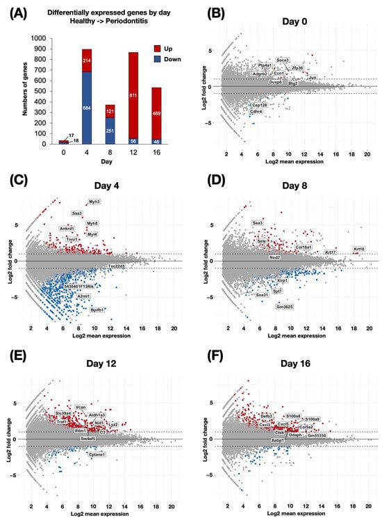 Temporal gene expression dynamics during periodontitis progression. (A) The number of differentially expressed genes (DEGs) at each time point (day 0, 4, 8, 12, and 16) comparing healthy and periodontitis-induced gingival tissues (n = 3 at each time point and in each group). Bars represent upregulated (red) and downregulated (blue) genes. (B–F) Volcano plots showing the distribution of DEGs at each time point (B) day 0, (C) day 4, (D) day 8, (E) day 12, and (F) day 16. Each dot represents a gene, with upregulated genes in red and downregulated genes in blue. Selected top genes based on fold-change and relevance are labeled. The x-axis represents the log2 mean expression and the y-axis represents the log2 fold change. The dashed horizontal lines indicate the threshold for significance.