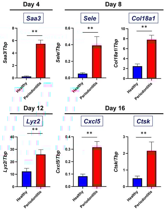Validation of the upregulated gene expression in RNA-seq. The gene expression of Saa3 (day 4), Sele (day 8), Col18a1 (day 8), Lyz2 (day 12), Cxcl5 (day 16), and Ctsk (day 16) in the gingival tissues from healthy or periodontitis-induced mice was examined by qPCR. n = 5 on each day and in each group. Data are present as mean ± standard error. ** p < 0.01 vs. healthy.