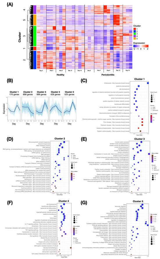 Gene expression profiles and functional enrichment analysis across five gene clusters in healthy and periodontitis-induced conditions. (A) Heatmap showing the temporal expression patterns of genes in clusters 1–5 during healthy and periodontitis-induced conditions. Gene expression is presented as a z-score, with red indicating upregulation and blue indicating downregulation. Clusters are color coded on the left. Time points are marked on the x-axis, with separate columns for healthy and periodontitis groups. (B) Dark blue lines representing the average gene expression pattern for each cluster over time (days 0–16) in periodontitis condition. Light blue lines represent the expression of all genes within each cluster. All expressions are presented as a z-score (C–G) of the functional enrichment analysis of the genes in clusters 1–5. Each symbol shows enriched Gene Ontology Biological Processes (GOBPs) (circle), Kyoto Encyclopedia of Genes and Genomes pathways (KEGGs) (square), or Reactome pathways (Reactome PA) (triangle) with the corresponding gene ratio (x-axis). The size of symbols represents the gene count in each term, and color indicates the adjusted p-value significance (red: high significance, blue: low significance).