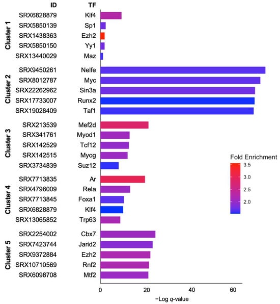 Enrichment of transcription factors (TFs) across five distinct clusters of experimental data. The graph presents TFs potentially regulating gene expression in each of the 5 clusters (cluster 1 to cluster 5) derived from RNA-seq analysis. The x-axis represents the negative log-transformed q-values (−Log q-value), which indicates the statistical significance of TF enrichment. Higher values correspond to greater significance. The y-axis lists the TFs associated with specific experimental IDs (reference datasets from Sequence Read Archive (SRA) data) within each cluster. Bar colors correspond to fold enrichment, with a gradient from blue to red. Blue: lower enrichment; red: higher enrichment.