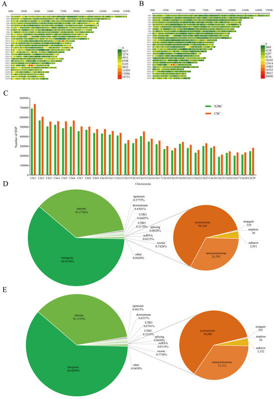 Distribution and functional annotation of SNPs in Xinjiang brown cattle and Chinese Simmental cattle. (A) Distribution of SNPs on autosomes in Xinjiang brown cattle. The horizontal coordinates indicate the density or number of SNPs, whereas the vertical coordinates indicate the positions or positional intervals of the 29 chromosomes. Different colors in the figure represent the number of SNPs per 1 Mb range: a color closer to red indicates a higher density of SNPs, a color closer to green indicates a lower density of SNPs, and gray indicates no SNP distribution at that position. (B) Distribution of SNPs on autosomes in Chinese Simmental cattle. (C) Frequency distribution of SNPs on 29 chromosomes of Xinjiang brown cattle and Chinese Simmental cattle. (D) Functional distribution of SNPs in Xinjiang brown cattle. The pie chart to the left displays the distribution of SNPs, including intergenic, intronic, upstream, downstream, UTR3, UTR5, splicing, ncRNA, and exonic regions, based on their location. The pie chart to the right displays the breakdown of exons, including nonsynonymous, synonymous, stop-gain, and stop-loss exons. (E) Functional distribution of SNPs in Chinese Simmental cattle.