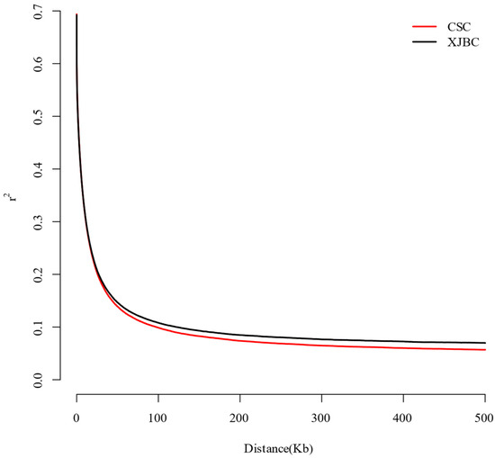 LD attenuation in Xinjiang brown cattle and Chinese Simmental cattle. The horizontal coordinate indicates the distance at which the LD occurred, whereas the vertical coordinate indicates the LD correlation coefficient r2.