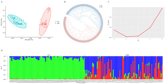 Population structure of Xinjiang brown cattle and Chinese Simmental cattle. (A) Principal component analysis of the two breeds. (B) Neighbor-joining tree of two breeds. (C) Admixture analysis cross-validation error. The abscissa is the K value (2–6), and the ordinate is the cross-validation error. (D) Analysis of the population structure of the two populations at K = 3. Every vertical line represents a sample, with the horizontal axis showing the sample number and the vertical axis indicating the percentage of subgroups or ancestors present in each sample. Various colors (blue, green, and red) distinguish between different subgroups or ancestors.