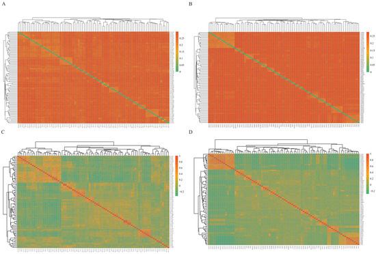 Genetic matrices of Xinjiang brown cattle and Chinese Simmental cattle. (A) Genetic distance matrix for Xinjiang brown cattle with IBS. The horizontal and vertical axes represent the individual numbers of the two breeds of cattle, and each small square represents the genetic distance value between two individuals. The closer the color is to orange, the greater the genetic distance; in contrast, the closer the color is to green, the smaller the genetic distance. (B) Genetic distance matrix of Chinese Simmental cattle with IBS. (C) Kinship G matrix of Xinjiang brown cattle. The horizontal and vertical axes represent the individual numbers of two breeds of cattle, and each small square represents the kinship coefficient between two individuals. The closer the color is to orange, the closer the kinship between individuals is. In contrast, the closer the color is to green, the more distant the kinship is. (D) Kinship G matrix of Chinese Simmental cattle.