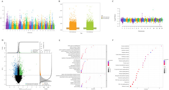 After GATK variant detection, a total of 10,669,376 high-quality SNPs were retained for analysis in Xinjiang brown cattle, whereas 11,722,337 high-quality SNPs were retained for Chinese Simmental cattle. The density distribution of high-quality SNPs on each chromosome is shown in Figure 1A,B. Figure 1C illustrates the distribution of SNPs on chromosomes in the two populations. Among the autosomes, Chr 1 was the longest (Xinjiang brown cattle: 158.39 Mb; Chinese Simmental cattle: 158.50 Mb) and contained the highest number of SNP loci (Xinjiang brown cattle: 691,843; Chinese Simmental cattle: 738,798); Chr 25 was the shortest (Xinjiang brown cattle: 42.33 Mb; Chinese Simmental cattle: 42.34 Mb) and contained the lowest number of SNP loci (Xinjiang brown cattle: 190,006; Chinese Simmental cattle: 212,032). The two breeds were functionally annotated using ANNOVAR software based on the filtered SNPs (Figure 1D,E). There were 6,488,949 SNPs located in the intergenic region of Xinjiang brown cattle, accounting for 60.8% of the total number of SNPs. There were 3,870,384 and 79,249 SNPs located in the intronic and exonic regions, accounting for 36.3% and 0.7% of the total number of SNPs, respectively. Within the exon region, there were 25,797 nonsynonymous mutations and 50,169 synonymous mutations. In Chinese Simmental cattle, 7,135,370 SNPs were located in the intergenic region, accounting for 60.9% of the total number; 4,235,503 and 90,944 SNPs were located in the intron and exon regions, accounting for 36.1% and 0.8% of the total number; and within the exon region, there were 31,112 nonsynonymous mutations and 56,088 synonymous mutations (Tables S1 and S2).