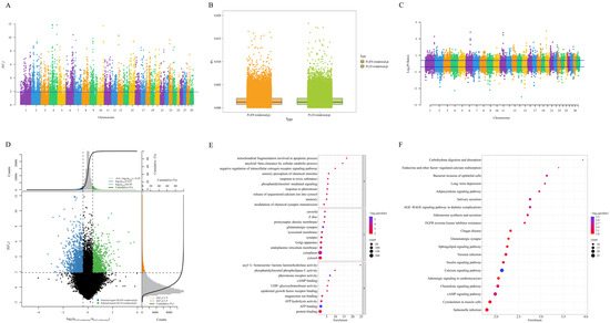 Analysis of selective signatures in Xinjiang brown cattle. (A) Manhattan plot of Fst. The blue line represents the threshold value for the top 5% based on the Z(Fst) (1.96). (B) PI boxplots of the HY and LY groups. (C) Manhattan plot of the θπ ratio. The blue lines represent the threshold value for the top 5% and the below 5% based on the Log2 (θπ ratio) (0.37 and −0.46). (D) Selective sweep analysis of Fst and θπ. The Log2Pi ratio value is shown on the horizontal axis, whereas the Z(Fst) value is indicated on the vertical axis. The frequency distribution plot is displayed at the top and right, whereas the dot plots in the middle depict the Z(Fst) and Log2Pi ratios for various windows. The uppermost blue and green areas represent the top 5% and bottom 5% of the regions selected based on the Log2Pi ratio, whereas the orange area on the right indicates the top 5% of the region selected by Z(Fst). The central blue and green areas denote the intersection of Z(Fst) and the Log2Pi ratio, which identifies the candidate loci for the HY group and the LY group, respectively. (E) GO enrichment analysis of candidate genes identified through the intersection of the two methods. (F) KEGG enrichment analysis of candidate genes identified through the intersection of the two methods.