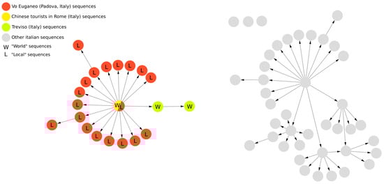 This feature was applied on a controlled set of real data comprising all the sequences sampled in the Italian municipality of Vo’ (Padua, Italy) between February and March of 2020, when the town was quarantined due to the first COVID-19-related deaths in Italy. The dataset, which is available on the GitHub page of VirNA (https://github.com/font71/VirNA, accessed on 20 February 2025), comprises a set of SARS-CoV-2 sequences downloaded from the GISAID database [] and sampled between January and March 2020 in Italy. The sequences are all associated with complete collection dates (“YYYY-MM-DD” format) and locations (“Continent/Country/City” format). None of the sequences includes ambiguous characters. The geographical analysis efficiently highlights the “entry” in Vo’ of the haplotype carried by a couple of Chinese tourists that traveled in Italy in January 2020, as previously observed in Manuto et al. []. The spread of this haplotype was mostly contained by the lockdown measure adopted. In the same time span descendants of the tourists’ haplotype were detected also in the near city of Treviso (Italy). This could represent an “exit” event from Vo’ (as detected by VirNA because of the choice of Vo’ sequences as “Local” sequences) or another “entry” event from Rome in Treviso. These details can be observed in Figure 2 where the yellow and red node represents both the tourists (“W” sequences) and Vo’ sequences (“L” sequences), the red nodes represent Vo’ sequences, while the green nodes represent sequences sampled in Treviso.