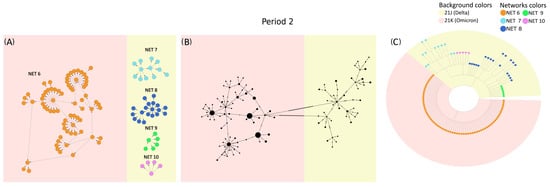 Sequences from time period 2 of the SARS-CoV-2 case study: networks generated by VirNA (panel (A)), network computed by PoPArt [] (panel (B)), and phylogenetic tree constructed using RAxML [] (panel (C)). In the MSNs computed by VirNA (panel (A)), the direction of arrows follows the principle of mutation accumulation. The background color in the phylogenetic tree (panel (C)) represents the viral variants of the terminal nodes and is consistently applied to the networks in panels (A,B). The color coding of networks in VirNA MSNs (panel (A)) is mirrored in the terminal nodes of the phylogenetic tree (panel (C)).