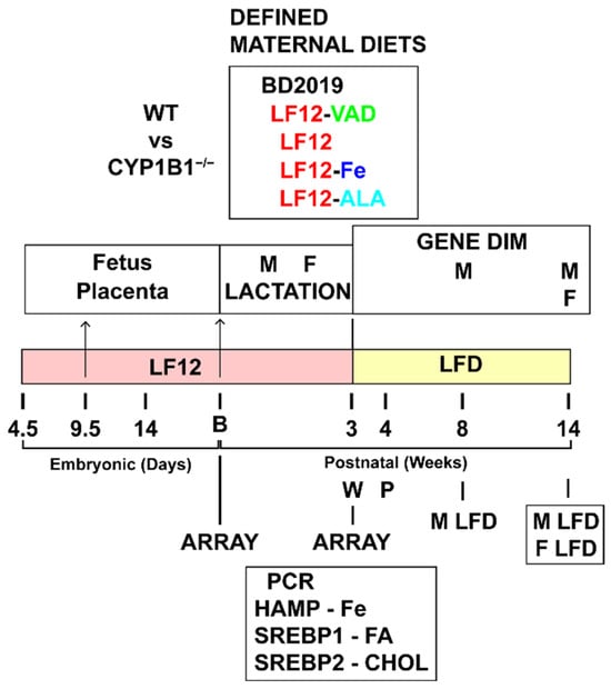 Experimental design for testing the impact of defined breeder diets and Cyp1b1 deletion on neonatal gene expression measured as mRNA levels. An optimized commercial soybean oil-based diet (BD2019 or BD) was used for breeding of nulliparous females. On day 4.5, LF12 cotton-seed oil-based diets deficient in ALA and lacking iron supplementation replaced the BD until P21 weaning. For all treatments, WT and Cyp1b1−/− C57BL/6J mice were used. LF12 was also supplemented with iron or ALA to BD levels or deprived of retinol (VAD). At birth, gene expression was measured for livers combined for a full litter at midday (P0.5). At P21, individual livers were characterized by specified mothers. For unbiased characterization of liver dimorphism, microarrays were assessed for male expression at week 8 and for female expression at week 14. Cyp1b1−/−/WT expression ratios were determined in males at week 14. Abbreviations—M: male, F: female, DIM: dimorphic, B: birth, W: weaning, P: puberty, FA: fatty acid, CHOL: cholesterol, VAD: vitamin A deficiency, ALA: α-linolenic acid, and LFD: low-fat diet. Key additional information on animals and diets coding is described in Section 4. Color coding used in the Tables is described in Section 4.5.