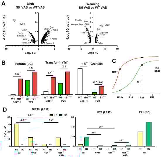 Birth and weaning Cyp1b1−/− changes compared to WT, each using LF12 defined diet. (A) Volcano plots log2 FC (fold change) versus Log10 p-value for N5 (Cyp1b1−/− backcrossed for 5 generations) at birth and weaning. (B) Birth and weaning expression for Ftl1, Trf, and granulin (Cyp1b1−/− vs. WT). (C) Model for high Cyp1b1−/− expression at birth that matches the WT weaning expression. (D) Effects of Cyp1b1−/− and VAD on Hamp (H1 and H2) expression at birth and weaning, showing the switch from Hamp1 to Hamp2 isoform in neonatal period. # p = 0.1; ** p < 0.01; xx p < 0.01.