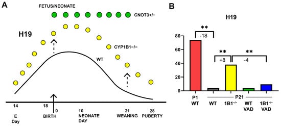 H19 stimulations at birth and P21/weaning and additive with the underlying postnatal decline but is stimulated by the post retinol/stellate cell intervention. (A) Scheme for H19 time course, birth to weaning. Stimulation by Cyp1b1−/− at birth matched the stimulation at P21, even though FC had increased from 1.7- to 8-fold. Regarding Cnot+/−, mice remain constant from birth to P21. (B) Effects of Cyp1b1−/− and VAD on H19 at weaning/P21. Dual Cyp1b1−/−/VAD (Blue) blocks stimulation in Cyp1b1−/− with sufficient retinol (Yellow). ** p < 0.01.