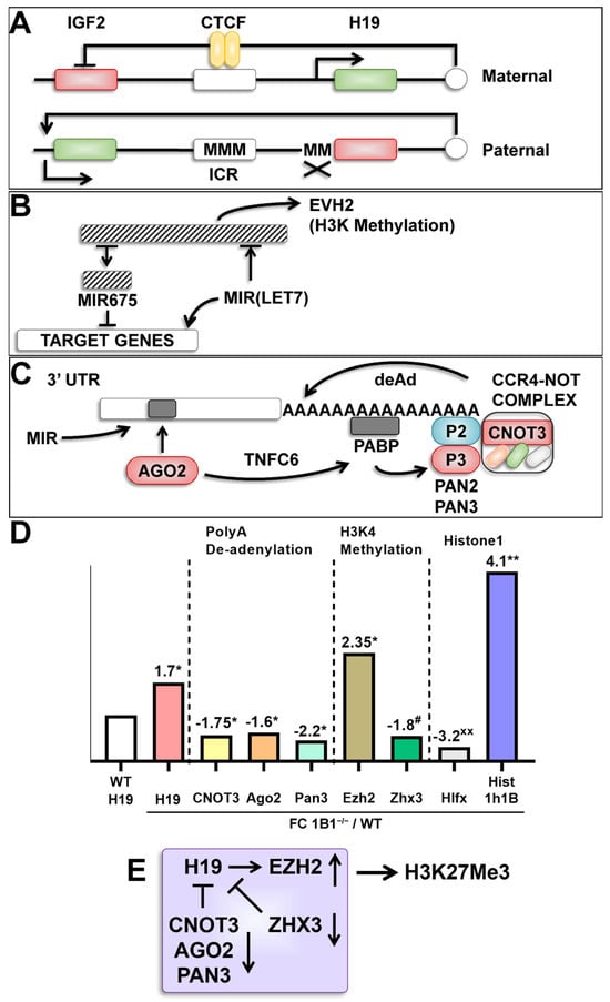 Cyp1b1 deletion effects on H19 are modulated perinatally by effects on Ago2, Pan3, and Cnot3 and by chromatin effects of Zhx3, Ezh2 and Hist1h1B (see Table 3). (A) H19 LncRNA is expressed from the maternally derived unmethylated gene (green). The regulator CTCF assists the binding of H19 to the open ICR element. Igf2 expression from the maternal gene (red) is blocked by CTSF. On the paternal chromosome, H19 and the ICR site are each methylated. CTCF does not bind; the H19 gene is inactive but Igf2 is transcribed. (B) Three mechanisms for H19 activity: miRNA-675 is cleaved to inhibit multiple target genes. H19 also sequesters miRNA (notably Lin7) to enhance the transcription of targeted genes. H19 binds to Evh2, a key mediator of H3 methylation. This histone modification is a common gene-suppression process. Evh2 activity is inhibited by Zhx3, which is suppressed. (C) The miRNA inhibition is a prime regulatory process that is modulated by H19. Ago2 mediates the miRNA suppression process by binding to the 7- or 8-base miRNA target sites in the 3′-UTR of susceptible genes. Ago2 partners with Tgfc6 and PolyA-binding protein (PABP) to recruit two de-adenylation complexes: Pan2/Pan3 and the Ccr4-Not multiprotein complex. Cnot3 is a key component of the Ccr4-Not complex that inactivates mRNA through de-adenylation and de-capping. (D) Stimulations of H19 and Evh2 matched by suppressions of modulators Ago2, Cnot3, Pan3, and Zhx3. (E) H19 connects to chromatin gene suppression through generation of gene-selective H3K27Me3. # p = 0.1; * p < 0.05; ** p < 0.01; xx p < 0.01.