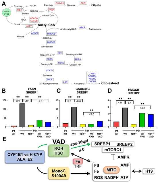 Effects of Cyp1b1 deletion and VAD on Coordinate regulation of fatty acids and cholesterol by Srebp forms. (A) Pathways for fatty acid and cholesterol synthesis, which are mediated by Srebp1c and Srebp2, respectively. (B–D) Effects of Cyp1b1−/−, VAD, and their combination on Srebp1 marker Fasn, co-expressed Gadd45g and Srebp2 mediated Hmg-CoA reductase. (E) Model of stellates link to intra-hepatocyte iron control processes. ** p < 0.01.