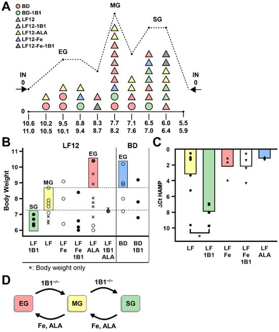 We also compared the effects of LF12 supplementations with, respectively, iron (LF12-Fe) and ALA (LF12-ALA). For birth analyses, we combined livers from individual litters. Previous microarray analyses have established comprehensive suppressions by Cyp1b1 deletion as a result of Srebp1 and Srebp2 activities [27]. PCR analyses were performed at P21, focusing on seven Srebp markers together with Hamp forms 1 and 2. Whole litters were used at birth and individual mice at P21. Treatment responses derived from Microarray data have been systematically color coded. This data also uses the same LIMMA designations for Statistical differences and is summarized in Section 4.5.