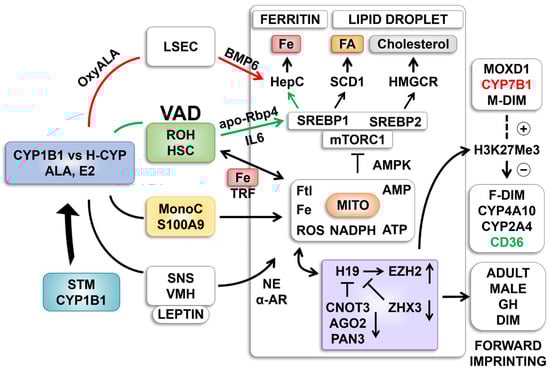 The rarity and specificity of the VAD intervention and two distinct types of crosstalk between VAD and Cyp1b1−/− implicate the HSCs. Both function for Srebp1, whereas only the Cyp1b1 deletion reversal is involved for the H19 stimulation group (Table 2, Figure 3) and the Srebp2–cholesterol regulation. HSCs link to Srebp1 through stimulations of cytokines that increase Stat3 via cytokine receptors on hepatocytes (Il-6/Il-6r) [62]. We hypothesized that HSCs link to a novel Cyp1b1-Fe control process that targets redox regulation and ferroptosis via transferrin/Trf and Ftl forms. Key elements for this redox unit include NADPH processing of ROS and mitochondrial generation of ATP that couples with both general energy metabolism and GTP-linked organelle fusion–fission cycling. Low energy is balanced by AMP kinase signaling. AMP kinase targets key proteins of the mTORC1 complex to suppress kinase activity [53]. mTORC1 kinase activity stimulates the essential activation cleavage of Srebp forms in the Golgi [53].