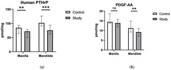 In the periosteum of the maxilla, a decrease in the levels of the human parathyroid hormone-like protein, IGF-1, and FGF-23 was observed compared to the control group, while in the periosteum of the mandible, a decrease in the human parathyroid hormone-like protein, PDGF, and IGF-1 was noted in comparison to the control group (Figure 1).